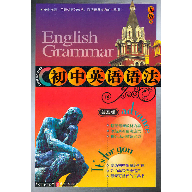 简介: 所有知识点条理呈现,理论透彻,归纳精彩,分类明晰,尽展英语语法的博大精深 凸显核心知识与重难点,明确初中阶段学习目标,直击英语学习要领,轻松突破语法,享受学习的快乐与收获的喜悦。 素净的色彩搭配,多样化的讲解与举例,灵活周到的版面布置,体现无敌英语的编创精髓,功能强大,高效吸收知识!