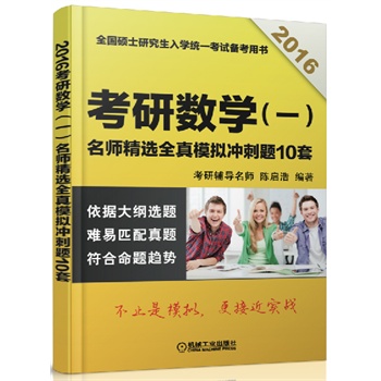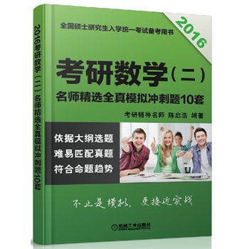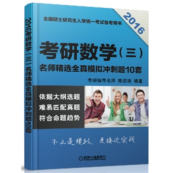 简介: 《全国硕士研究生入学统一考试备考用书·2016考研数学(三):名师精选全真模拟冲刺题10套》是考研数学冲刺阶段的复习指导书,适用于参加“数学三”考试的学生书中包含了10套精心设计的模拟试题,题目难度稍高于考研真题难度这些题目大部分为首次公开发布,非常适合考生用来检验复习效果和临考重点复习。 《全国硕士研究生入学统一考试备考用书·2016考研数学(三):名师精选全真模拟冲刺题10套》的解答部分,不仅给出了详尽解答,还特别针对考试重点和难点进行了扩展复习《全国硕士研究生入学统一考试备考用书·2016考研数学(三):名师精选全真模拟冲刺题10套》可作为考生自学的复习材料,也可作为考研培训班的辅导教材,还可供大学数学基础课程的教学人员参考